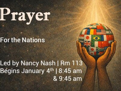 Prayer Led by Nancy Nash Room: 113 (off South Lobby) | 8:45 – 9:40 | Are you concerned about our nation? Join our Prayer Meeting. Receive a short prayer guide based on current events, including: praise reports, prayer points, declarations, and verses. See InfoCenter or email WeeklyPrayerNotes@gmail.com and subscribe.