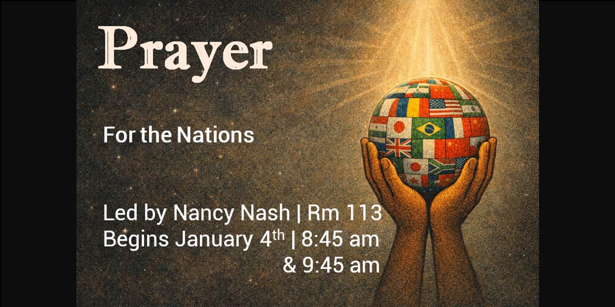 Prayer Led by Nancy Nash Room: 113 (off South Lobby) | 8:45 – 9:40 | Are you concerned about our nation? Join our Prayer Meeting. Receive a short prayer guide based on current events, including: praise reports, prayer points, declarations, and verses. See InfoCenter or email WeeklyPrayerNotes@gmail.com and subscribe.