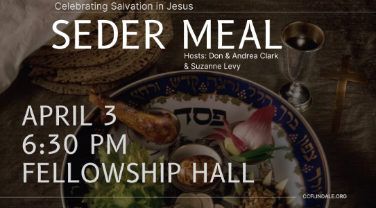Event DetailsDate: April 3, 2026Time: 6:30 pm - 8:30 pmLocation: CCF - Community Christian FellowshipRegister HereEvent DescriptionCelebrate Easter in a meaningful way by remembering the death, burial, and resurrection of Jesus through the Passover meal experience. All ages welcome. [Register Here]CCF Lindale