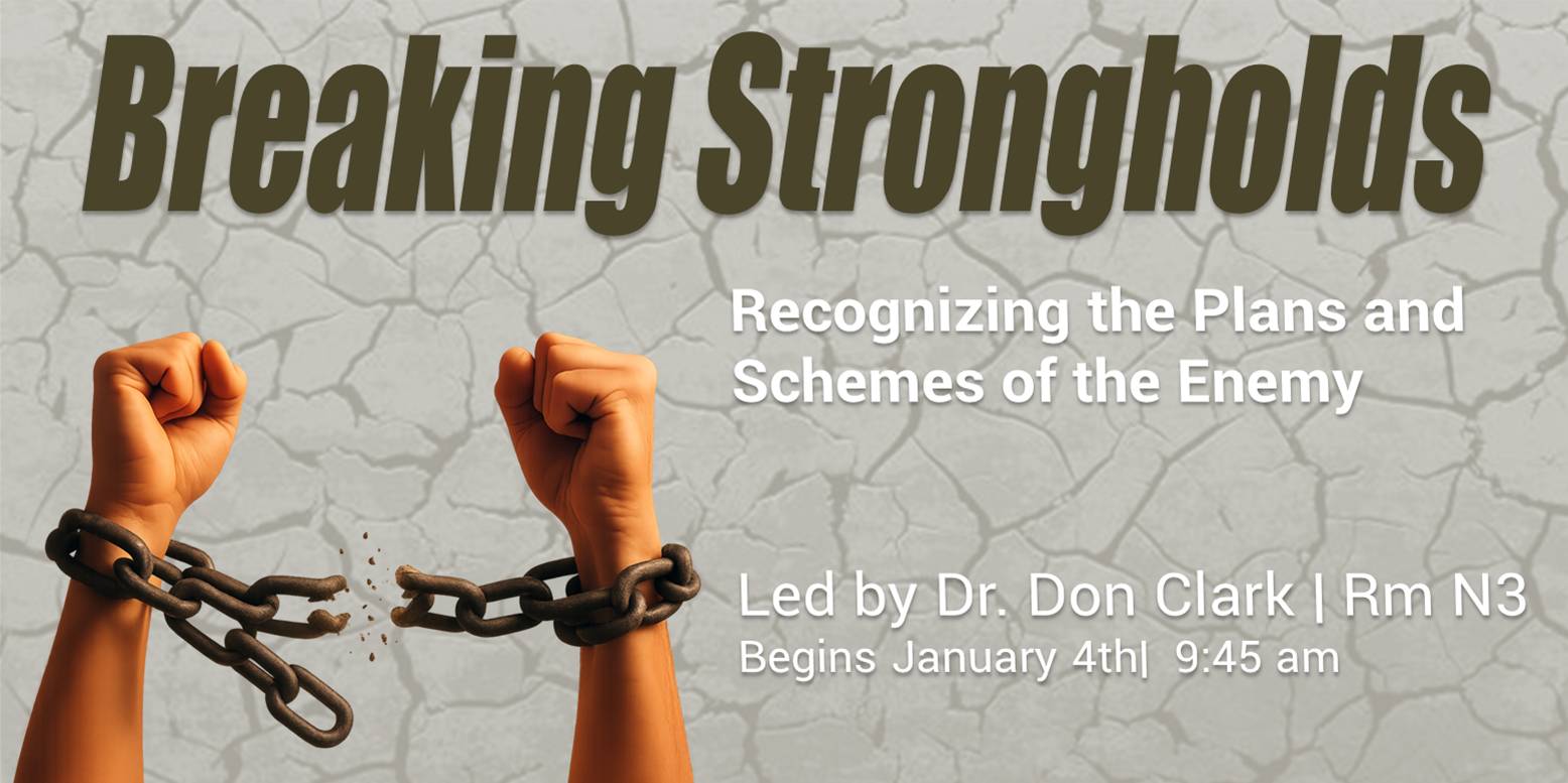 Breaking Strongholds Recognizing the Plans and Schemes of the EnemyLed by Dr. Don Clark | Rm N3 Paul tells us in Ephesians 6 to “Put on the whole armor of God, that you may be able to stand against the wiles, or craftiness, of the devil…” In this 13-week Sunday class, we will learn how to identify areas of our lives where we have aligned with the enemy. Some of these areas are generational, passed down from our parents, grandparents, or even our great-grandparents. Recognizing these strongholds, we can repent and ask for forgiveness, thereby taking authority over the enemy and …